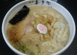 東の「麵屋喜多郎愛子店」です。最近のくにちゃんのお気に入り店の一つです。ここはメニューも豊富で基本あっさりとこってりが選べます。初訪の時はあっさりを食べ、スープの美味さに惚れたくにちゃんです。今日はこってりに挑戦。オーダーはくにちゃんのお気に入りでもあり、このお店のお勧めでもあるワンタン麺¥830を大盛+¥150で。お店の外に坂内製麺と書いてありますが、自家製麺とのこと(web調べ)。数分でラーメン登場。どんぶり一面に背脂。スープを一口飲むと。背脂の割には結構あっさり。元々のスープの旨味に背脂の味コクが加わり、あっさりとは全くの別物みたいです。こちらもいいですね。