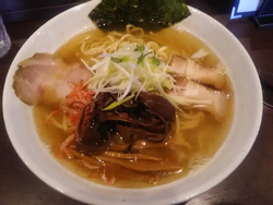 長岡市台町に今年4月にopenした「キラリボシ」です。長岡駅東口の大通りから宮内方面に小さな路地2本行った第四銀行台町支店の裏の方にあります。ちょっと目立たない店舗で、小さな看板を見落とさないでください。駐車場も店舗前には無く、店前の道を第四銀行側に入ったすぐにある駐車場の1台分だけです。一応キラリボシの小さな看板があります。入ってすぐに券売機があります。塩味と醤油味であっさりの清湯スープとこってりの白湯スープからなっています。初訪なので、定番の一番左上にあるキラリ塩ラーメン大盛¥800を購入し店内へ。カウンター席に座り、しばしの待ち。テーブル上にスープの説明が。どうやらラーメンによってスープを使い分けているようです。つまりスープに自信のあるお店ですね。くにちゃんオーダーの清湯塩味のらーめんは清湯醤油味とともに、鶏ガラ、丸鶏、鴨ガラの動物系素材と昆布、鰹節(2種類)、操舵鰹、煮干、サバ、サンマ、干し貝柱干し椎茸などの魚介野菜系素材から作られたスープを使用しているとのこと。らーめん登場。澄んだスープに2種類のチャーシュー、メンマ、キクラゲ、海苔、白髪ねぎと干しエビ。どんぶり面を覆った脂。スープはアツアツで一口飲むと鶏脂の旨味はもちろん、鴨脂の旨味も合わさり、何とも言えない旨味。久しぶりに美味いと思えたスープです。このスープに干しエビがいいアクセントを与えるんです。麺は中太麺をちょっと軟らかめに提供しています。くにちゃん的には細ストレート麺を堅めに茹でた麺で食べてみたいような・・・ かなりのクオリティのラーメンです。また行こうっと。次は白湯かな?!
